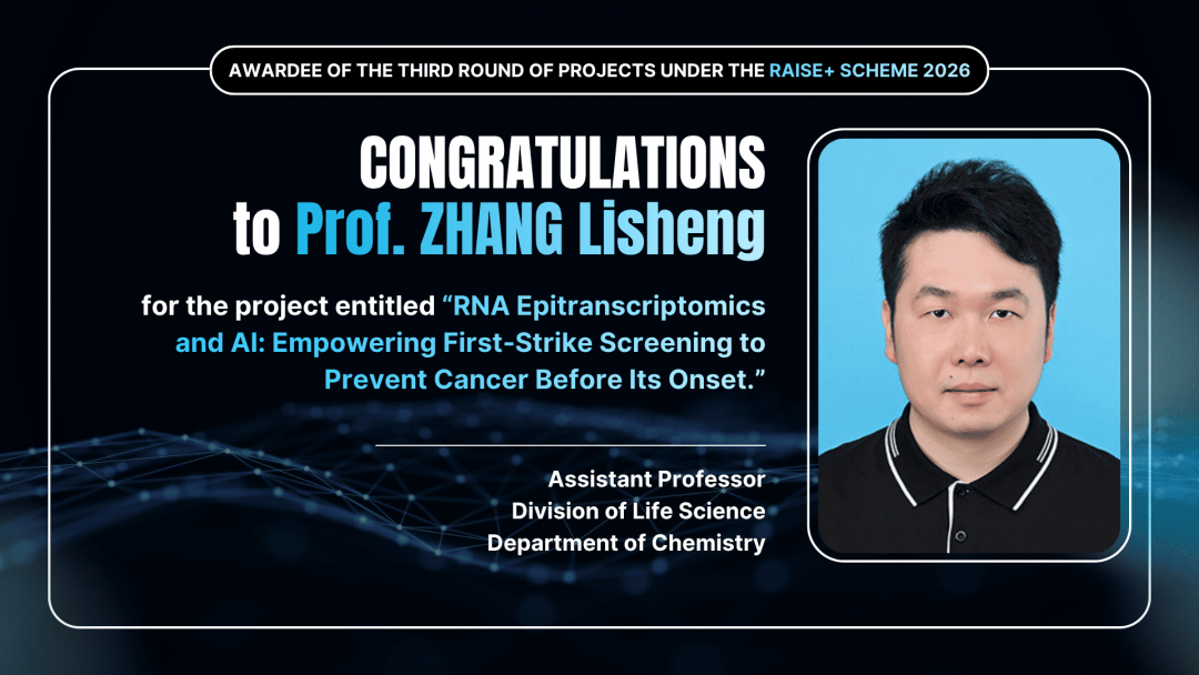 Congratulations to Project Leader Prof. ZHANG Lisheng, (Assistant Professor in the Division of Life Science and the Department of Chemistry), whose project has been selected for funding: “RNA Epitranscriptomics and AI: Empowering First‑Strike Screening to Prevent Cancer Before Its Onset”.