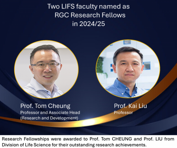 The HKUST Faculty Recognition Ceremony 2024 took place on December 4 to honor and celebrate the outstanding achievements of the University’s faculty during the 2023-24 academic year. Among the 22 honorees, Division of Life Science faculty members Prof. Tom CHEUNG and Prof. Kai LIU were recognized for being named as RGC Research Fellows for 2024/25.