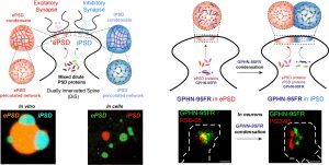 They used biochemical reconstitutions in vitro and in cells and found that these PSDs form distinct groups of molecules through a process called phase separation, similar to how oil and water separate into layers. The molecules within the excitatory postsynapse group stick together, as do the molecules within the inhibitory postsynapse group. Importantly, these groups do not mix with each other.